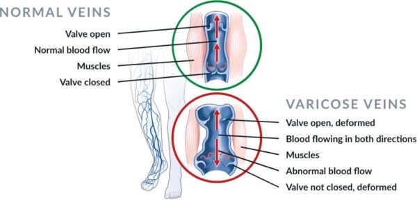 The valves act as one-way flaps, preventing blood from backing up and pooling in the lower legs. When these one-way valves don’t work properly, blood then may flow backwards, causing the veins to enlarge and become varicose.
